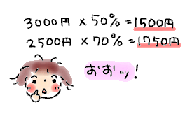 例えば3000円という値段をつけた商品、すぐに売れるとお客様には50%の1500円をお返しします。 すぐに販売できなかったときは・・・? そんな時はぜひ値下げを! 2500円に値下げしても、売れたら70%の1750円がお手元に。 値下げをしても返金額はしっかり☆ という仕組みになっているんです。 お受付後、随時の価格変更には手数料が必要です。(1点1回ごと100円) |